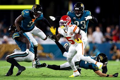 Kansas City Chiefs v Jacksonville Jaguars JACKSONVILLE, FLORIDA - OCTOBER 06: Marquise Brown #5 of the Kansas City Chiefs carries the ball as he attempts to evade Andrew Wingard #42, Foye Oluokun #23, Tyson Campbell #3, and Devin Lloyd #0 of the Jacksonville Jaguars during the second quarter at EverBank Stadium on October 06, 2025 in Jacksonville, Florida. (Photo by Megan Briggs/Getty Images) (Megan Briggs/Getty Images)