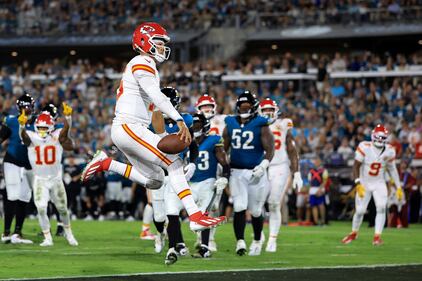 Kansas City Chiefs v Jacksonville Jaguars JACKSONVILLE, FLORIDA - OCTOBER 06: Patrick Mahomes #15 of the Kansas City Chiefs scores a touchdown against the Jacksonville Jaguars during the second quarter at EverBank Stadium on October 06, 2025 in Jacksonville, Florida. (Photo by Mike Carlson/Getty Images) (Mike Carlson/Getty Images)