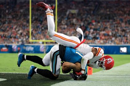 Kansas City Chiefs v Jacksonville Jaguars JACKSONVILLE, FLORIDA - OCTOBER 06: Travis Hunter #12 of the Jacksonville Jaguars catches the ball against Bryan Cook #6 and Chamarri Conner #27 of the Kansas City Chiefs during the third quarter at EverBank Stadium on October 06, 2025 in Jacksonville, Florida. (Photo by Mike Carlson/Getty Images) (Mike Carlson/Getty Images)