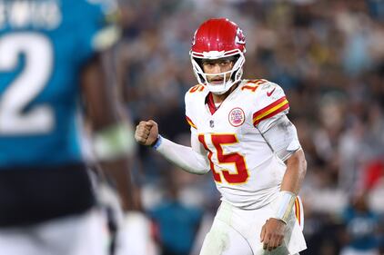 Kansas City Chiefs v Jacksonville Jaguars JACKSONVILLE, FLORIDA - OCTOBER 06: Patrick Mahomes #15 of the Kansas City Chiefs reacts after a rushing touchdown by Kareem Hunt #29 against the Jacksonville Jaguars during the third quarter at EverBank Stadium on October 06, 2025 in Jacksonville, Florida. (Photo by Megan Briggs/Getty Images) (Megan Briggs/Getty Images)