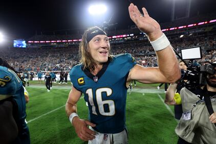 Kansas City Chiefs v Jacksonville Jaguars JACKSONVILLE, FLORIDA - OCTOBER 06: Trevor Lawrence #16 of the Jacksonville Jaguars celebrates a touchdown against the Kansas City Chiefs during the fourth quarter at EverBank Stadium on October 06, 2025 in Jacksonville, Florida. (Photo by Megan Briggs/Getty Images) (Megan Briggs/Getty Images)