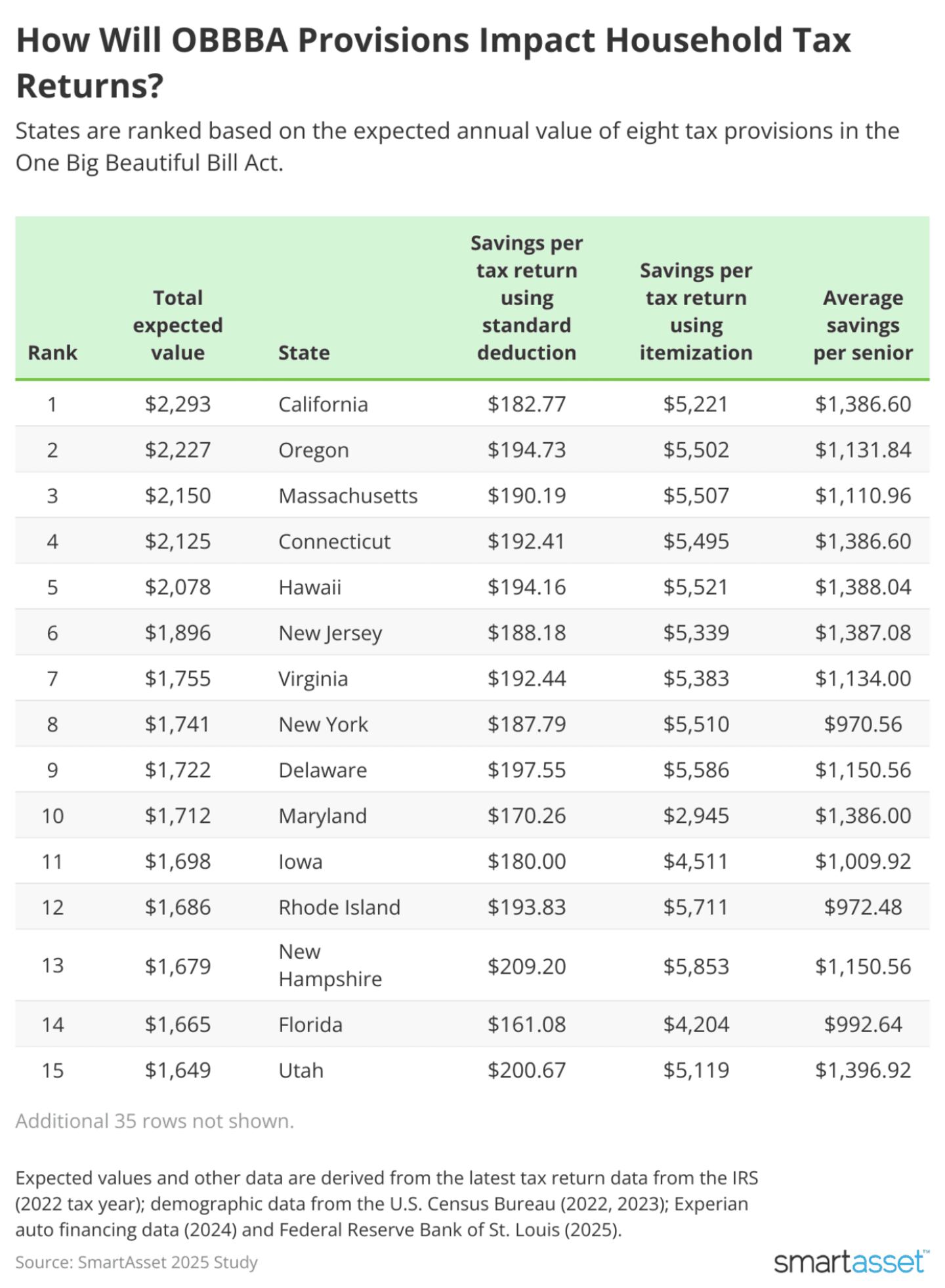 Households may want to size up the potential impact of OBBBA provisions on their tax strategies, tax prepayments and overall budgets. With this in mind, SmartAsset calculated the expected value residents in each U.S. state may see for the upcoming tax years, thanks to eight different OBBBA provisions, based on the most recent tax return data, financial and demographic data. Additionally, average dollar benefits for families with children, seniors, inheritance, tipped workers, new car purchases and more are distilled at the state level.