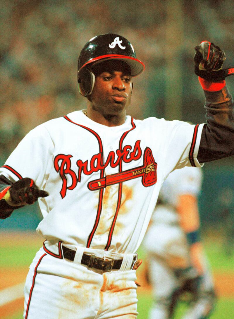 Deion Sanders Atlanta Braves' Deion Sanders reacts after scoring in the third inning from third base on a sacrifice fly to tie Game 6 of the World Series at 1-1, at Atlanta, Oct. 24, 1992. (AP Photo/Rusty Kennedy) (Rusty Kennedy/AP)