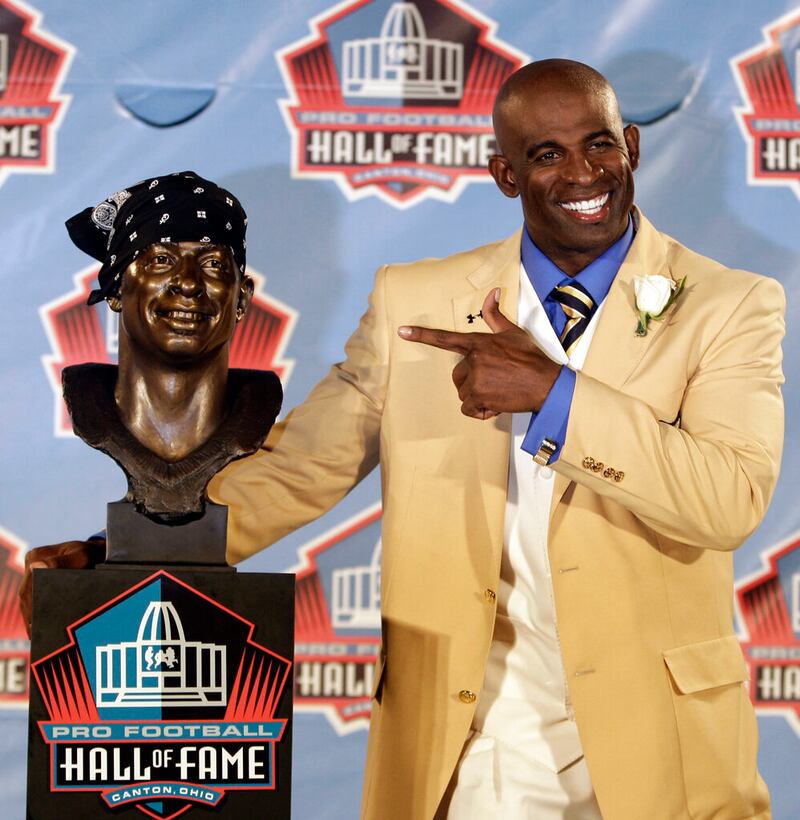 Deion Sanders Deion Sanders poses with a bust of himself during the induction ceremony at the Pro Football Hall of Fame, Saturday, Aug. 6, 2011, in Canton, Ohio. (AP Photo/Tony Dejak) (Tony Dejak/ASSOCIATED PRESS)