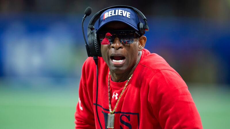 Deion Sanders Jackson State head coach Deion Sanders yells during the first half of the Cricket Celebration Bowl NCAA college football game against South Carolina State, Saturday, Dec. 18, 2021, in Atlanta. South Carolina State beat Jackson State 31-10. (AP Photo/Hakim Wright Sr.) (Hakim Wright Sr./AP)