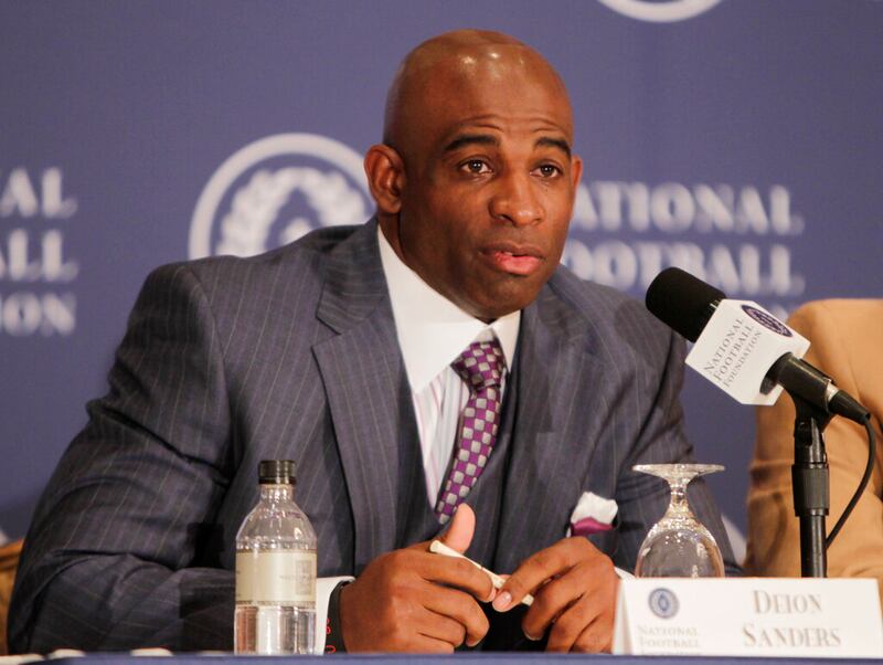 Deion Sanders Former NFL and baseball player Deion Sanders, walks on the field during the second half of an NFL football game between the Atlanta Falcons and the Tampa Bay Buccaneers, Thursday, Sept. 18, 2014, in Atlanta. (AP Photo/David Goldman) (David Goldman/AP)
